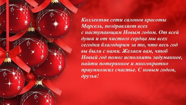 Уважаемые клиенты! Сеть салонов красоты Марсель, поздравляет вас с Новым 2020 годом! Пусть наступающий год подарит всем вам радость, хорошие вести, плодотворные идеи, радостные моменты. Мы хотим вам пожелать всего самого лучшего. Надеемся, что Новый год принесет нам с вами еще более крепкие деловые отношения, а мы постараемся и впредь радовать вас своей работой. За время нашего с вами сотрудничества вы стали для нас больше, чем клиентами. Вы стали нам настоящими друзьями. С праздником вас!