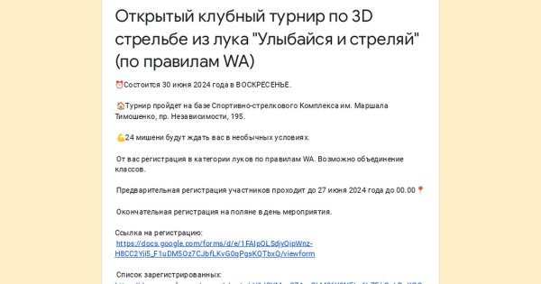 Открытый клубный турнир по 3D стрельбе из лука «Улыбайся и стреляй» (по правилам WA) ⏰Состоится 30 июня 2024 года в ВОСКРЕСЕНЬЕ. Турнир пройдет на базе Спортивно-стрелкового Комплекса им. Маршала Тимошенко, пр. Независимости, 195. 24 мишени будут ждать вас в необычных условиях. От вас регистрация в категории луков по правилам WA. Возможно объединение классов. Предварительная регистрация участников проходит до 27 июня 2024 года до 00.00 ‼️ Окончательная регистрация на поляне в день мероприятия. Ссылка на регистрацию: Список зарегистрированны… — Читать дальше