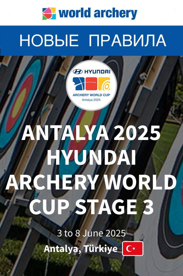 3—8 июня 2025 года на Кубке Мира в Анталии пройдут соревнования по новым правилам World Archery. Международная федерация World Archery хочет протестировать новые правила на 3-ем Кубке Мира в Анталии. Если все пройдет успешно, правила могут принять с 2026 года. Какие изменения: — квалификация для блочного и рекурсивного луков — 60 выстрелов. Квалификация проводится без перерыва. 6 выстрелов в серии. — Вместо X записывается 11. Пробоины записываются: 11, 10, 9, 8, 7, 6, 5, 4, 3, 2, 1, M — Максимальное количество баллов для блочного и рекурсивного… — Читать дальше